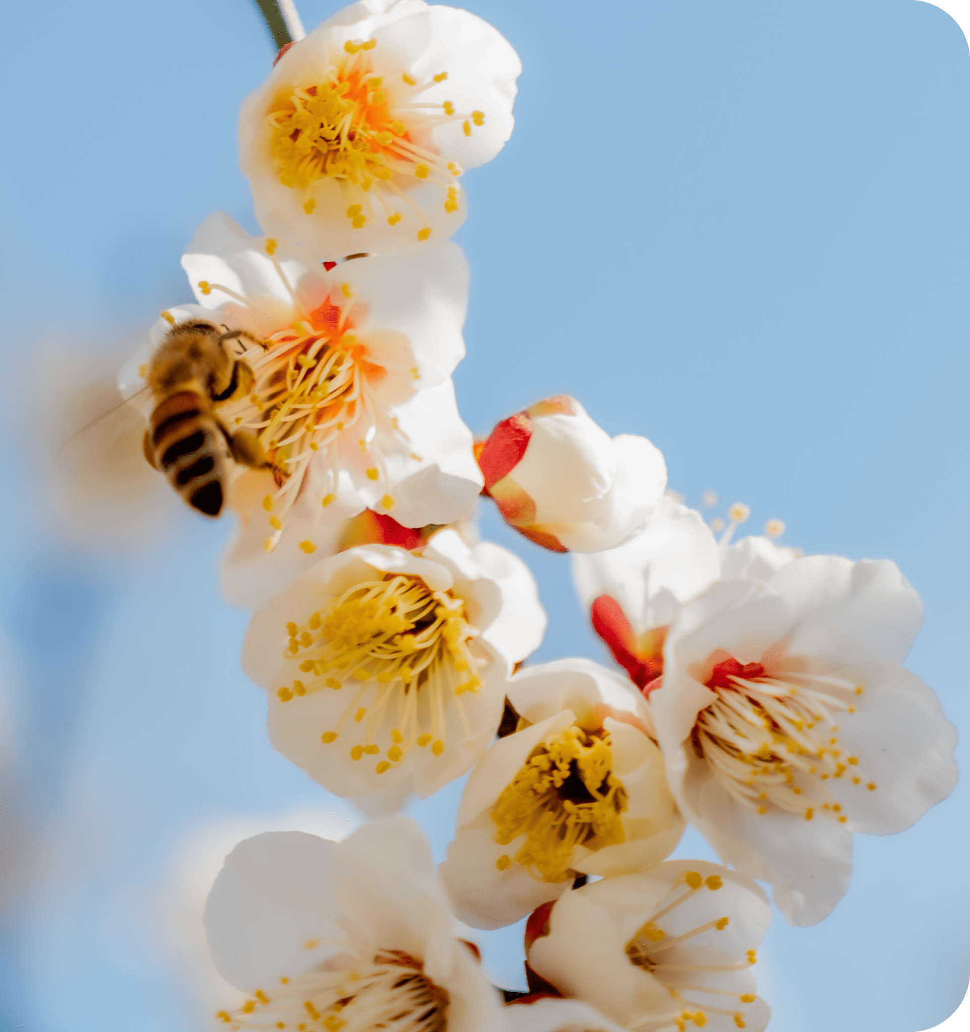 この時期、風とともに訪れる蜂や昆虫たちが受粉を助け、次第に梅の実が育つ準備が進みます。