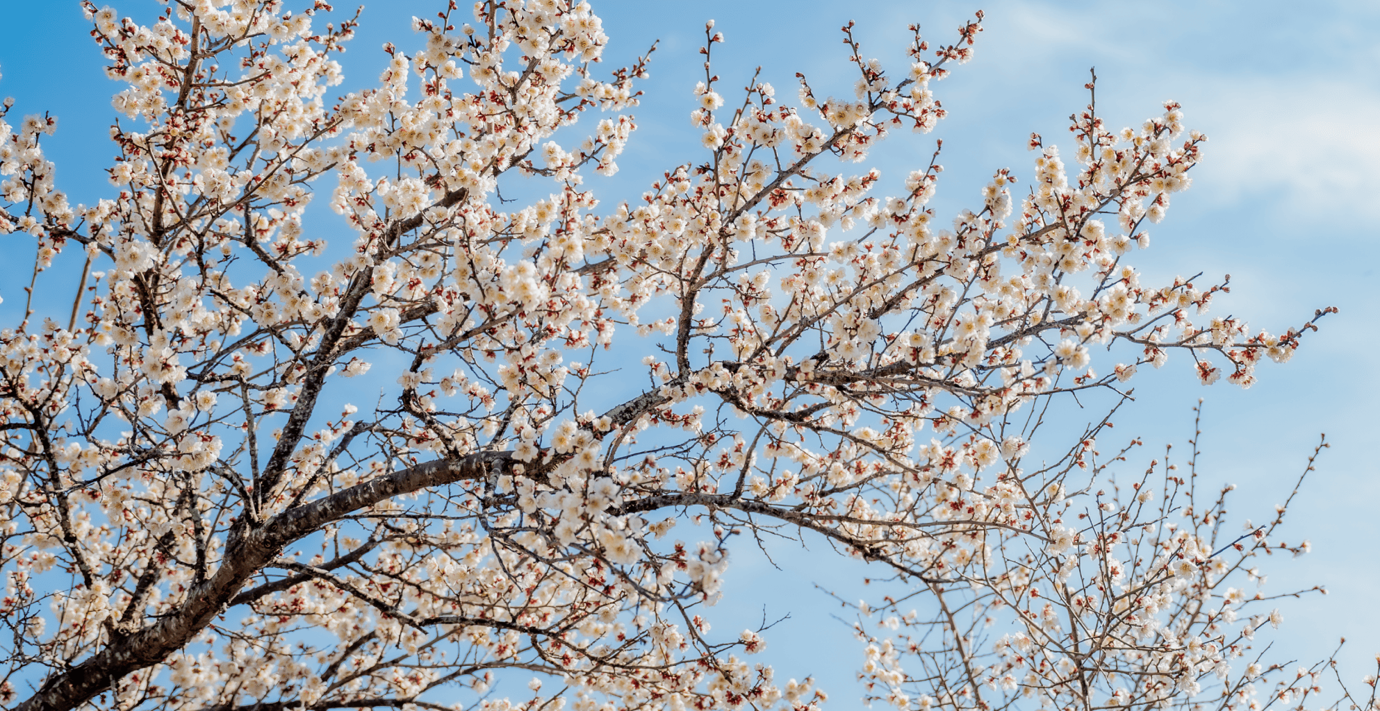 早春の2月頃、まだ寒さが残る中、白や淡いピンクの花を咲かせ、梅の木全体がほのかな花の香りに包まれます。